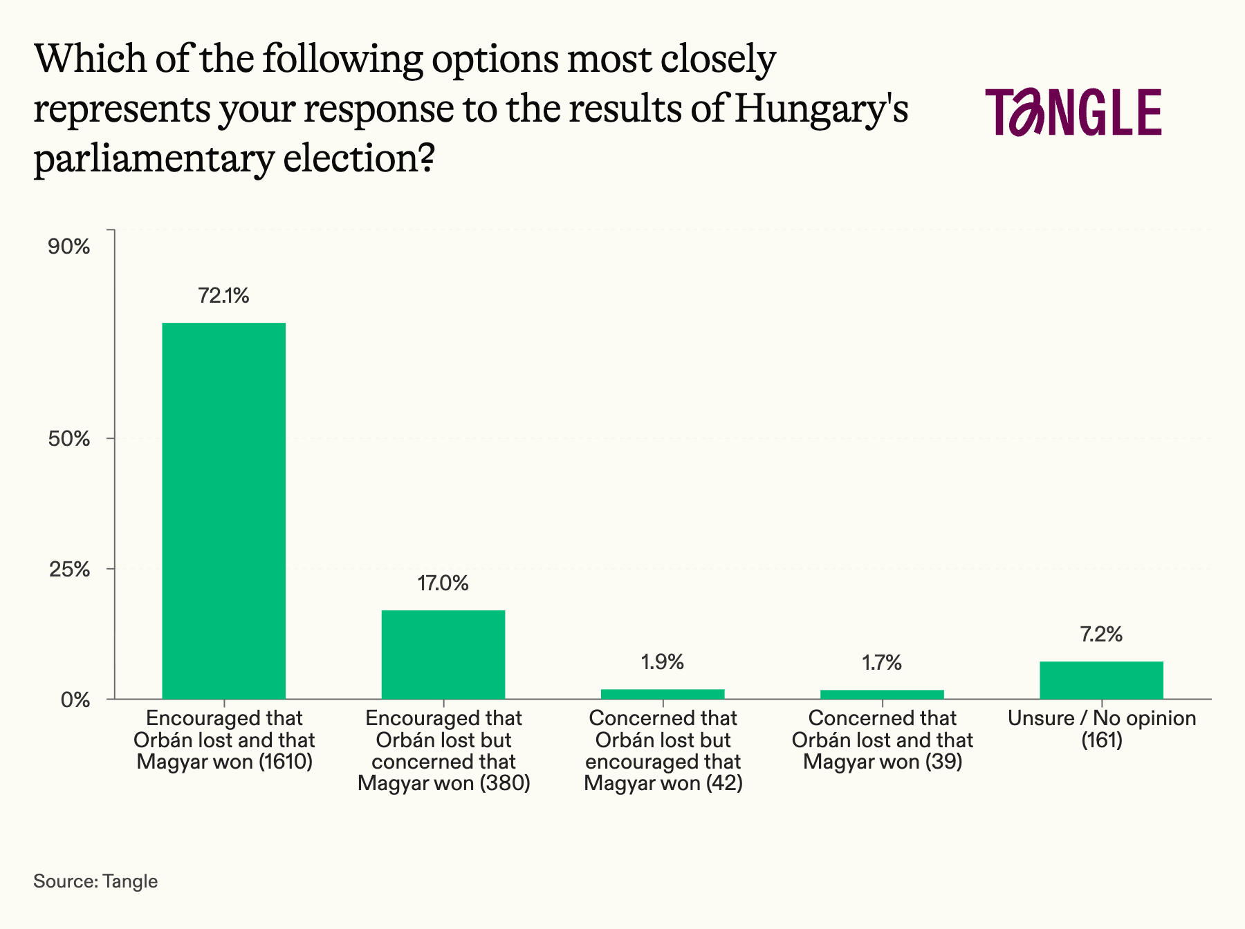 - Our last survey: 2,232 readers responded to our survey on Hungary’s elections with 72% encouraged that Orbán lost and that Magyar won. “Too early to tell, but this might be just a reset for a postliberal way forward,” one respondent said. “I’m happy that Magyar won, but I have a bad feeling he has some aces up his sleeve,” said another.