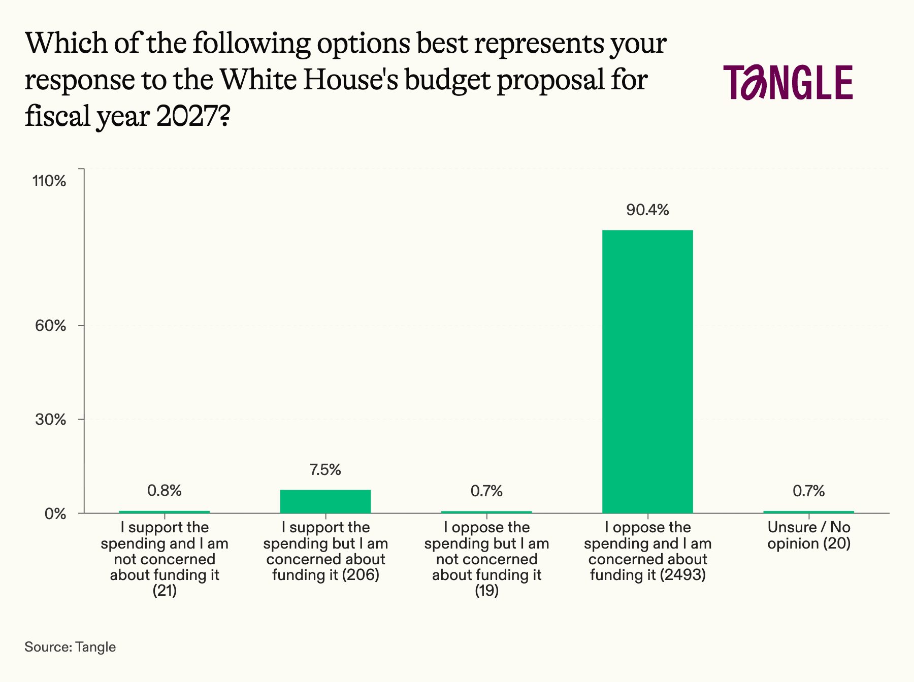 - Our last survey: 2,759 readers responded to our survey on Trump’s 2027 budget with 90% opposing the plan and expressing concern over funding it. “National defense is the primary role of the federal government. However, the party of fiscal restraint continues to increase the national deficit and debt,” one respondent said. “We’ll only have peace when we pay more for it than we do for war,” said another.