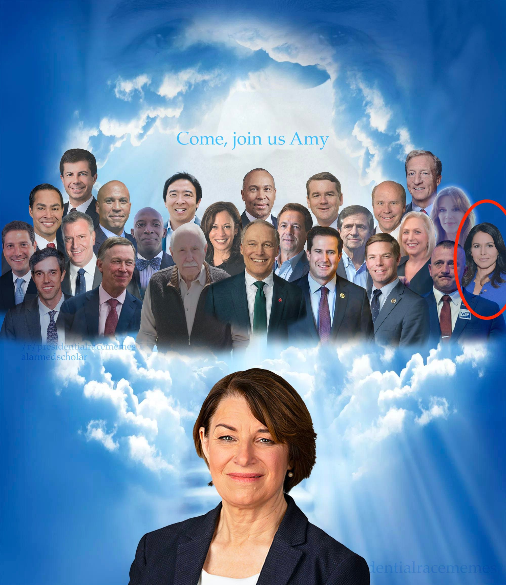 Q: I noticed in your graphic of Amy Klobuchar joining the "dead" campaigns, Tulsi Gabbard was on the right-hand side. Yet, although absolutely no one in the media is talking about her, she is still running and showing up in the poll results. My question is, why is she still running? A rumor I heard is that she is running to spite Hillary and give more credence to her lawsuit. Also, why is the media not even mentioning her name?