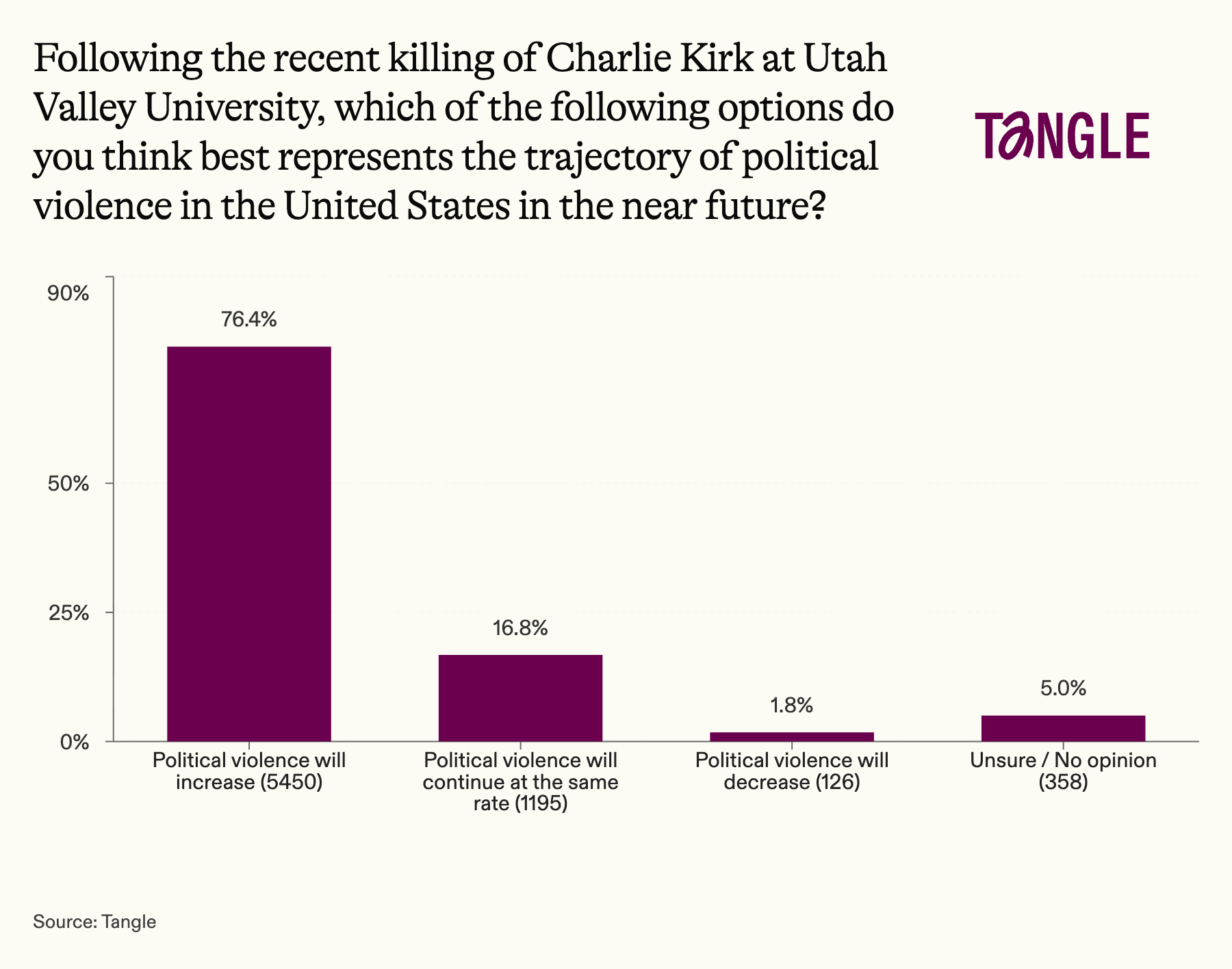 - Thursday’s survey: 7,129 readers responded to our survey on political violence with 77% saying they believe it will increase after Charlie Kirk’s assassination. “I am scared that it will become like school shootings -- horrible at the moment and for a few days after, but occurring again and again,” one respondent said.