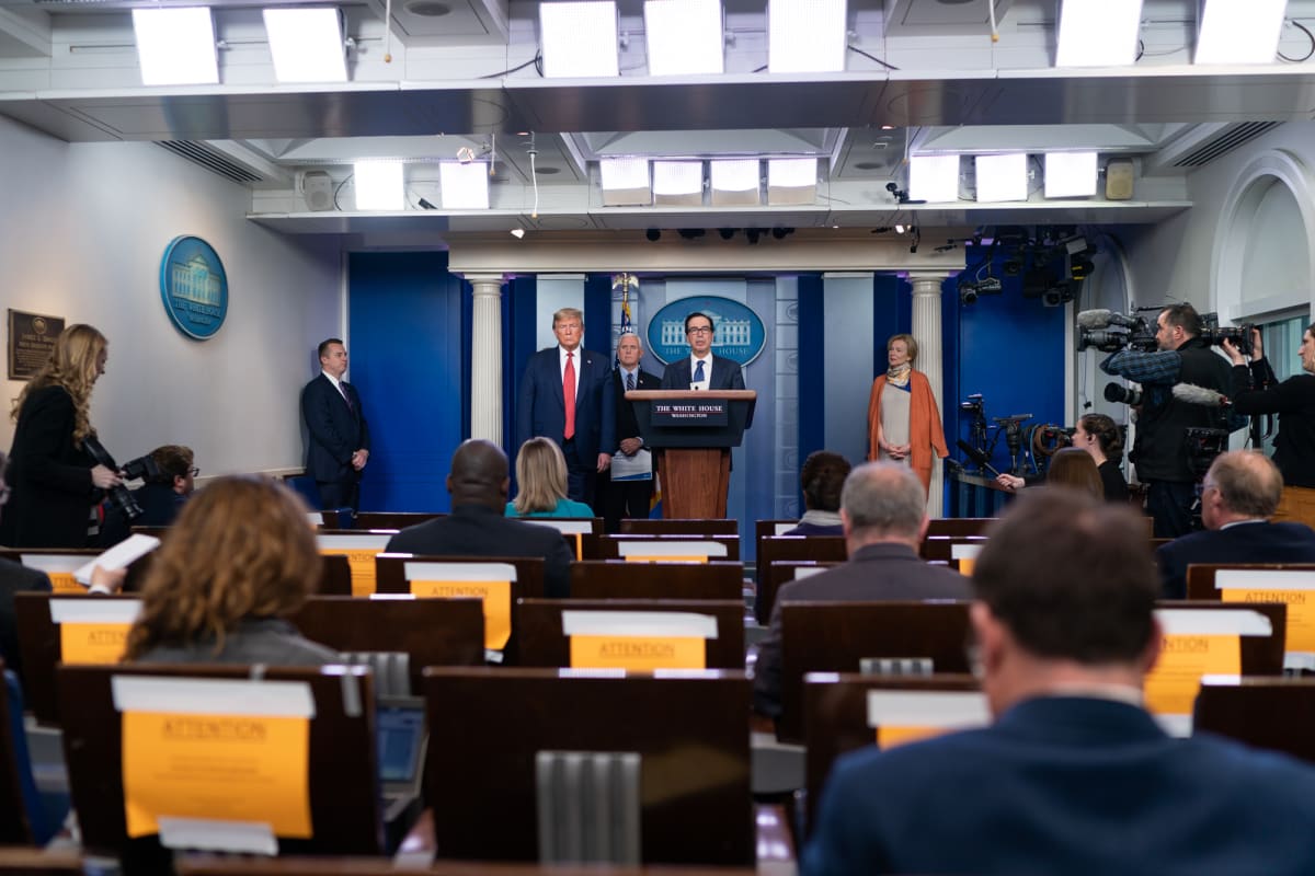 Steve Mnuchin (at the podium) stands with Donald Trump and Mike Pence. Mnuchin is leading negotiations on the next COVID-19 bill. Photo: White House.