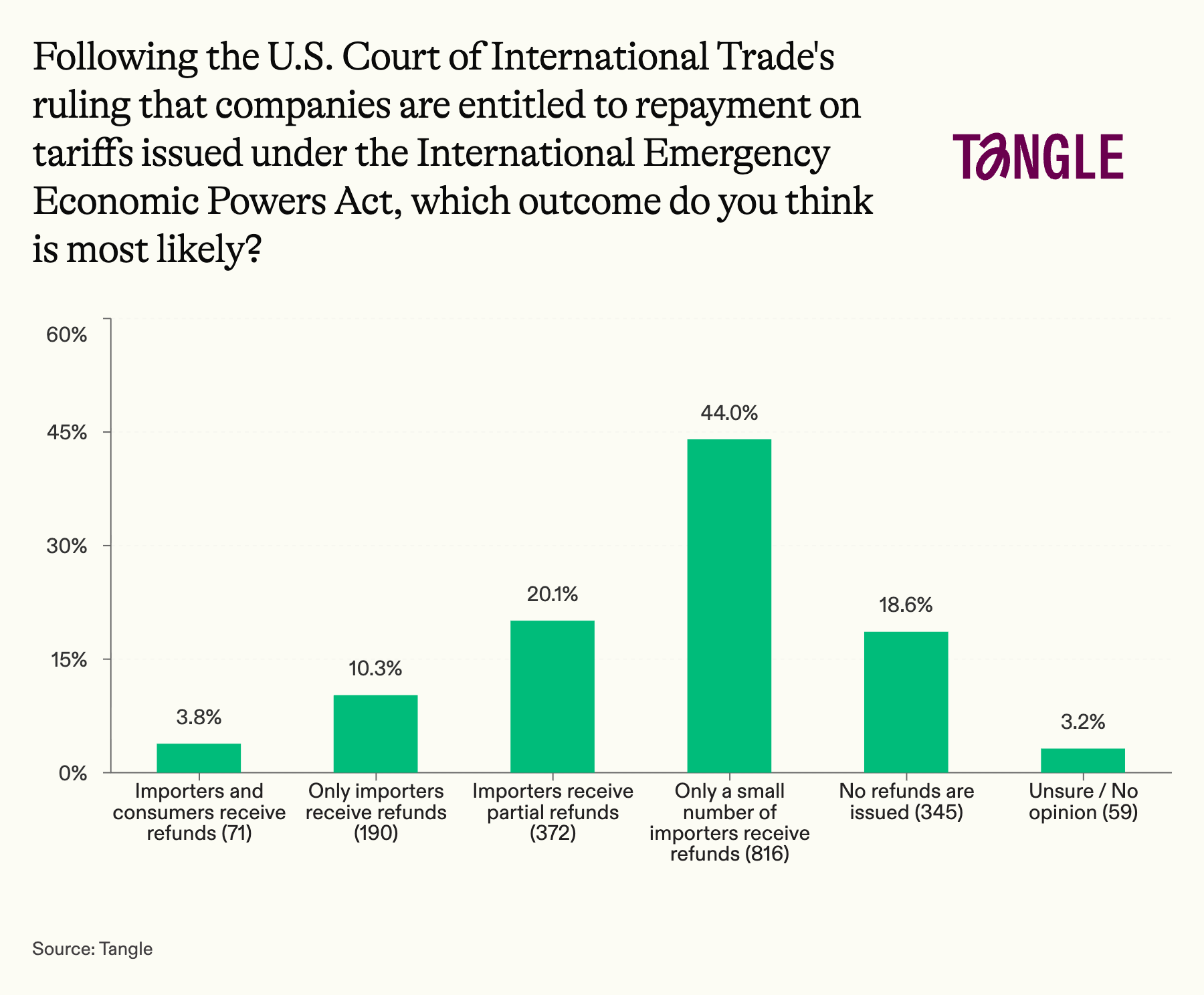 - Yesterday’s survey: 1,853 readers responded to our survey on tariff refunds with 44% predicting only a small number of importers will receive refunds. “I think everyone will see a refund. The real question is when,” one respondent said. “We’ve seen this is the administration of playing favorites; I have no reason to think they won’t play favorites with who gets refunds, too,” said another.