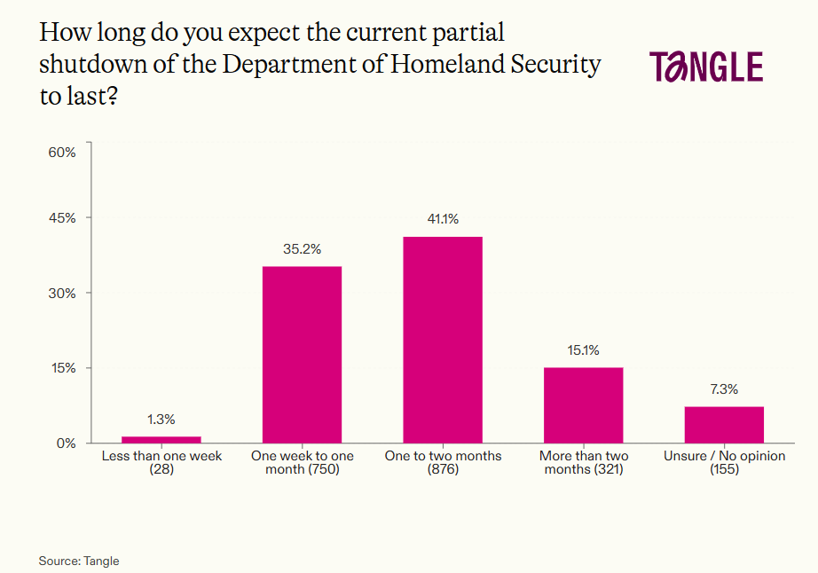 - Yesterday’s survey: 2,130 readers responded to our survey on the DHS shutdown with 41% saying they expected it to last one to two months. “Hopefully it will be long enough to force Republicans to agree to the common sense restrictions on behavior of the law enforcement agencies,” one respondent said. “I hope until Democrats realize siding with criminals (including violent protesters) does not sit well with a super majority of Americans,” said another.