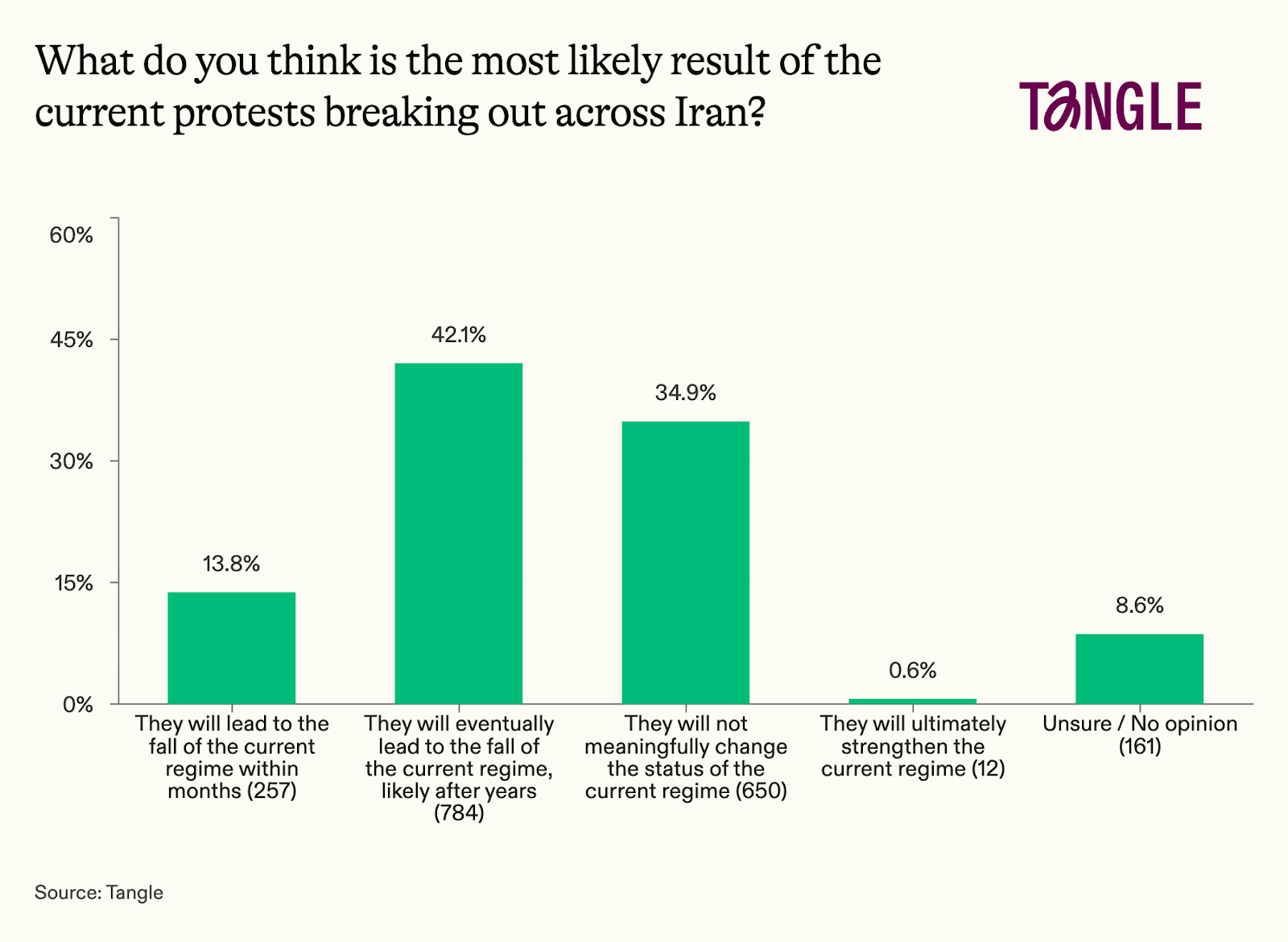 - Yesterday’s survey: 1,864 readers responded to our survey on the Iranian protests with 42% saying they will eventually lead to the fall of the regime. “I think the situation overall is becoming untenable for the Iranian people. I’m skeptical it will kick off change right away, but it feels like we’re sliding toward a change,” one respondent said. “I’ve seen this too many times before. Nothing will change,” said another.