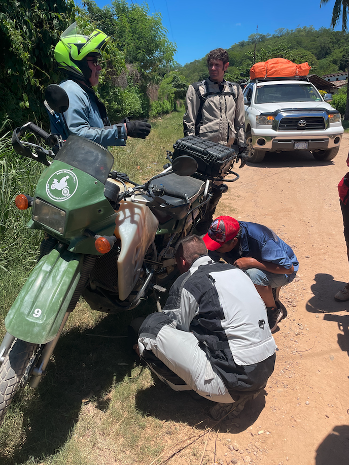 Marco was fine. A few scrapes and a little shaken up, but the bike was a little bit of a mess. The fall had stripped the bolt on his crash bars, and Chris needed to replace it with something that wasn't so big it'd rub against the chain of his bike. Lico, who is like a moth to flame any time a car hood or toolbox opens, almost seemed excited at the opportunity to fix something. He, Chris, and Federico huddled around the bike and did about an hour of work while the rest of us sat in the shade and Marco did a little sulking. It was a bummer, and the loss of about an hour cut a waterfall hike short, but we all insisted honestly that it was no big deal and the adventure was really just beginning. This was part of the fun.