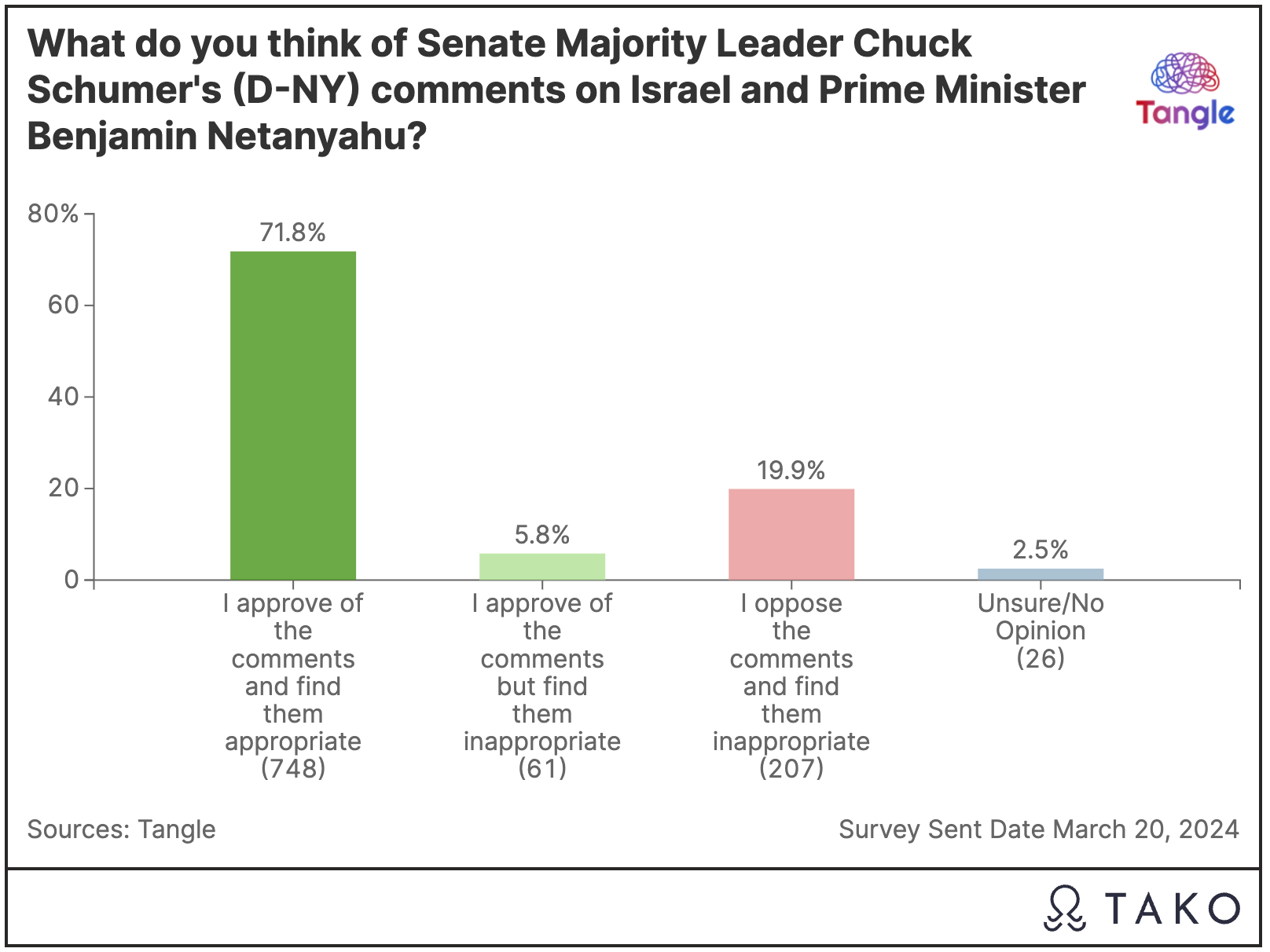 Yesterday’s poll: 1,050 readers took our poll on Schumer’s comments about Netanyahu with 72% approving and finding them appropriate. “It’s inappropriate to accuse Schumer of ‘interfering’ with a foreign ally when we fund a not insignificant portion of their Defense. The US providing that funding is also a form of ‘interference,’” one respondent said. Due to an error in the poll, we did not have a response category for people who opposed Schumer’s comments but found them to be appropriate.