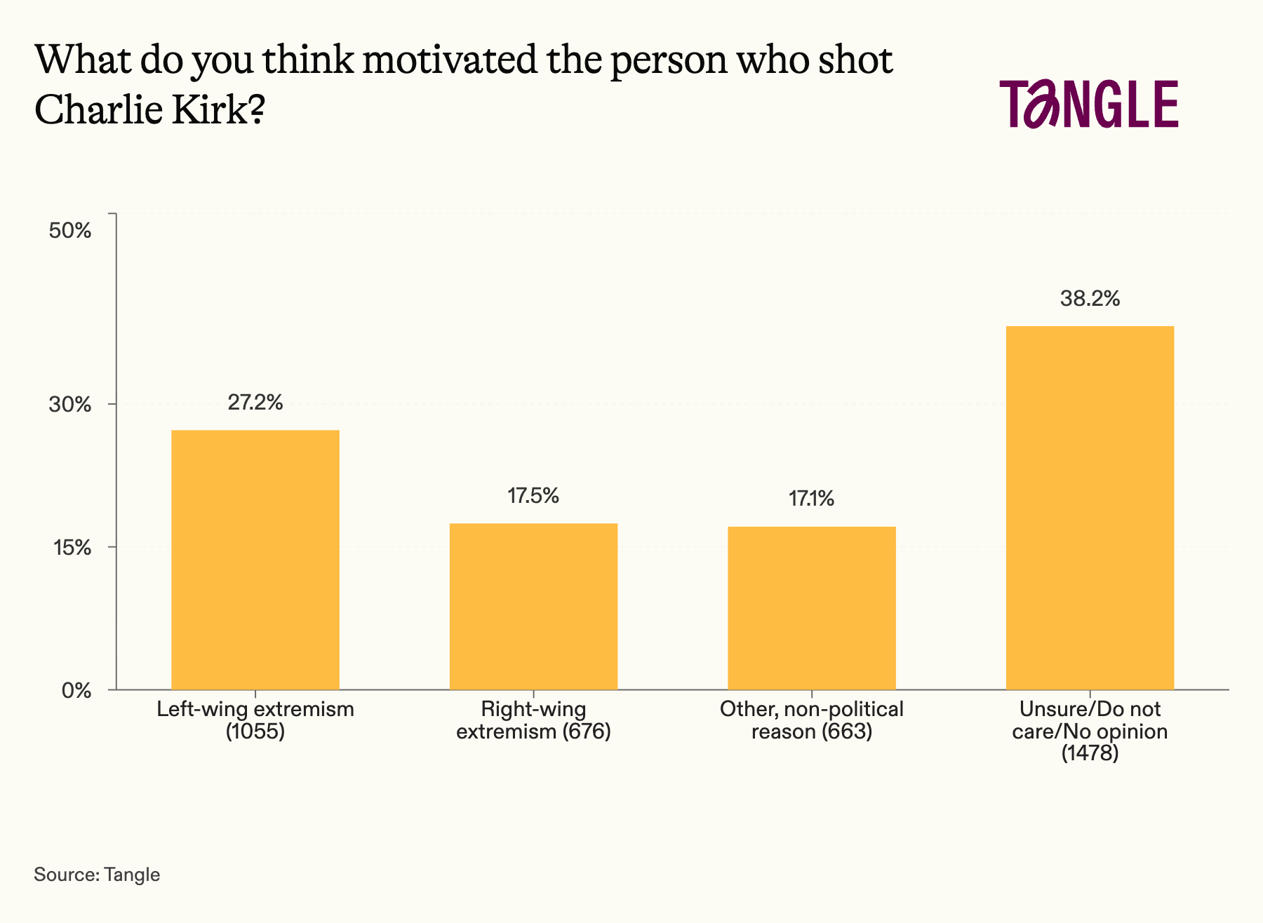 - Yesterday’s survey: 3,872 readers responded to our survey on the potential political motivations of Charlie Kirk’s shooter with 38% saying they are unsure, do not care, or have no opinion. “There isn't enough information as of yet to understand his motivations,” one respondent said.