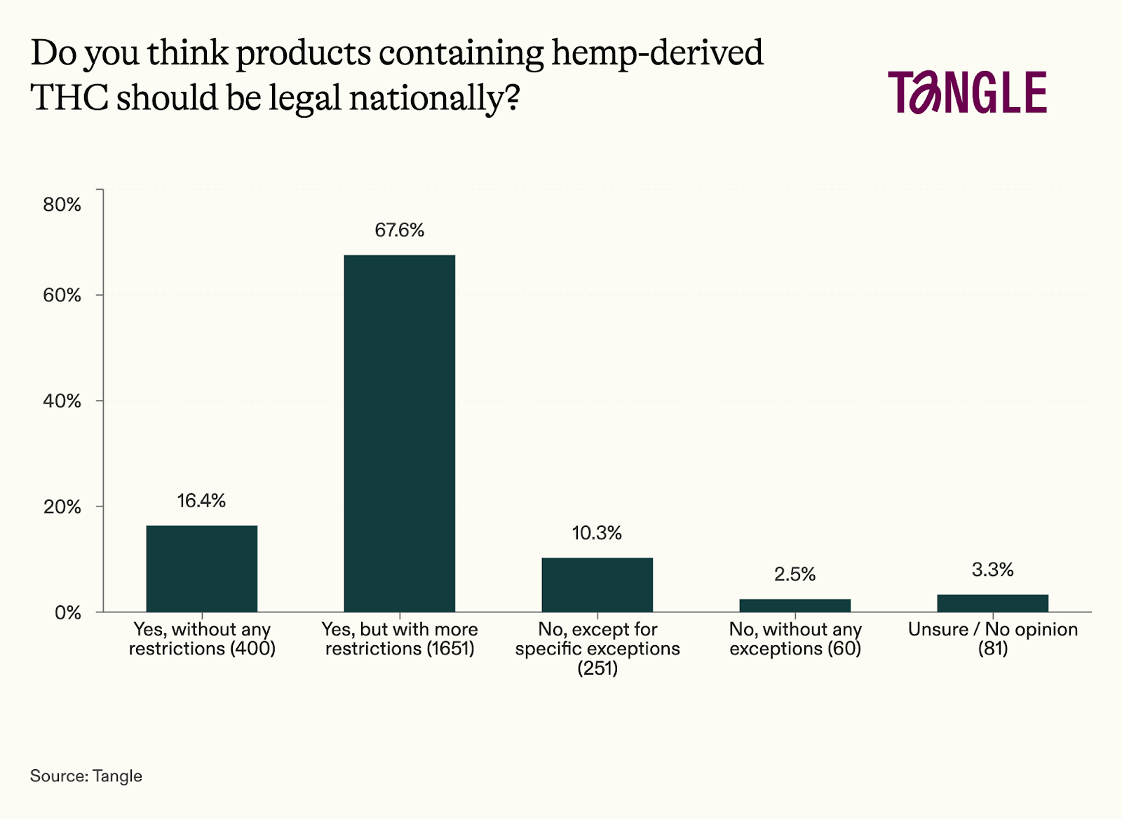 - Yesterday’s survey: 2,443 readers responded to our survey asking if hemp-derived THC products should be legal with 68% saying they should be legal with more national restrictions. “We don’t ban cigarettes or alcohol outright and, in my opinion, these are worse. Why would we ban hemp-derived THC?” one respondent said. “Cannabis has been genetically altered to such an extent that it is far more potent today than it was in the past. It needs far more control than it gets,” said another.