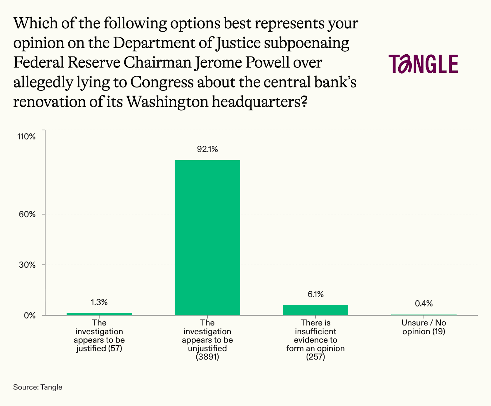 - Yesterday’s survey: 4,224 readers responded to our survey on the Justice Department’s investigation into Jerome Powell with 92% saying it appeared to be unjustified. “It is an outrageous stunt and will backfire on the White House,” one respondent said. “Let’s let the investigation play out as we don’t know if it is justified or not,” said another.
