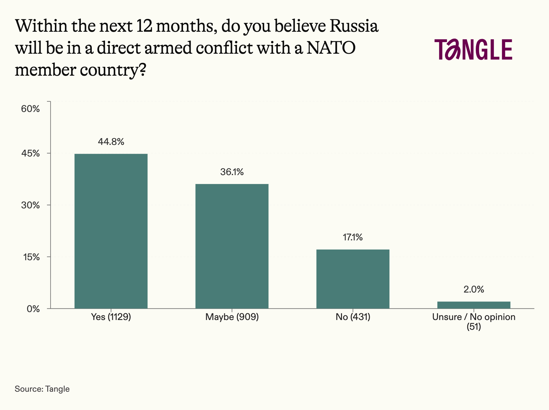 - Yesterday’s survey: 2,520 readers responded to our survey on the possibility of a direct conflict between Russia and a NATO country with 45% saying they believe one is likely within the next 12 months. “It depends on what the US does or does not do,” one respondent said.