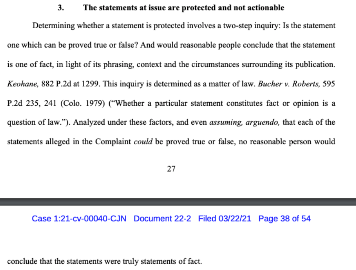 I want to be clear about something here: millions of people did conclude that her statements were truly statements of fact, because she swore up and down they were, publicly and repeatedly claimed that her evidence for them was forthcoming, and (as her lawyers acknowledge above) proceeded to take her claims to court.