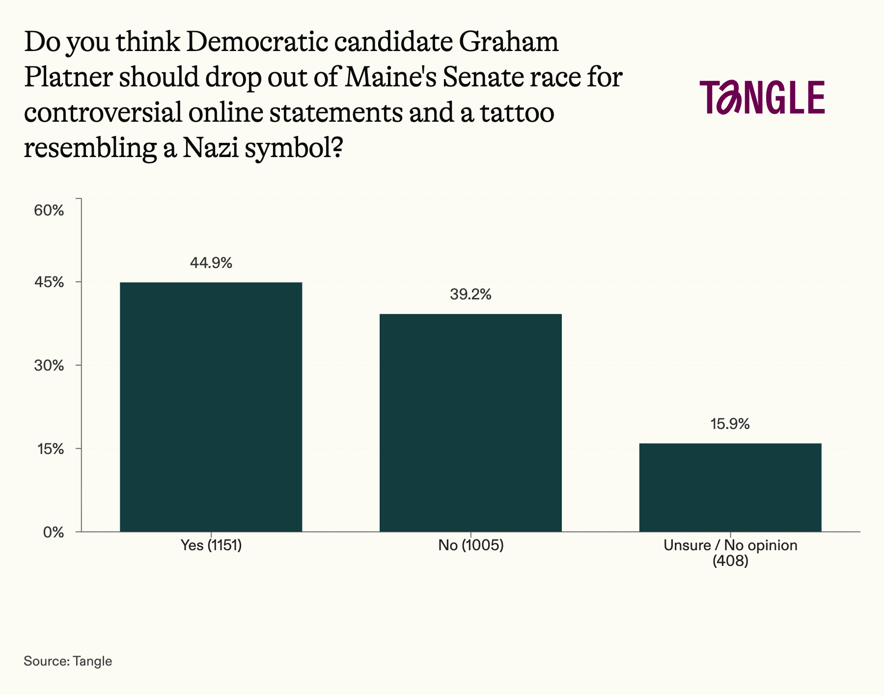- Thursday’s survey: 2,564 readers responded to our survey on Graham Platner’s scandals with 45% saying Platner should drop out of the race. “The comments and tattoo are major issues, certainly. And if there was evidence of change in the past 10 years I might consider supporting him but there is no contrition, no acts of penance,” one respondent said. “I wouldn’t vote for him, but let the primary voters decide,” said another.