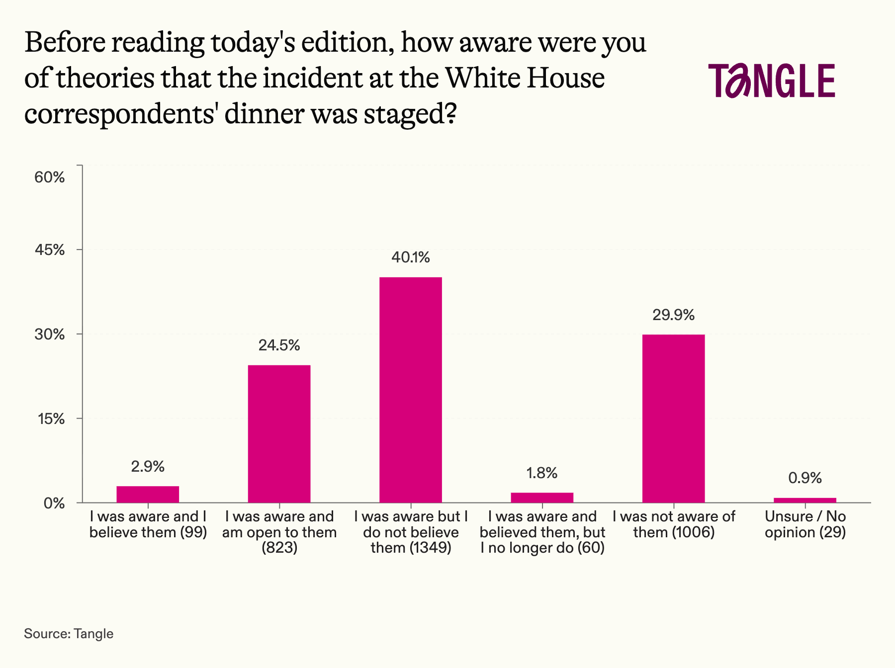 - Our last survey: 3,366 readers responded to our survey on theories that the shooting at the White House correspondents’ dinner was staged with 42% saying they were aware of the theories but did not, or now do not, believe them. “I’m open to them, but there’s not really any evidence beyond the weird pivot to ‘and this is why I need a ballroom,’” one respondent said. “I considered that it might’ve been staged, but before long was convinced it wasn’t,” said another.