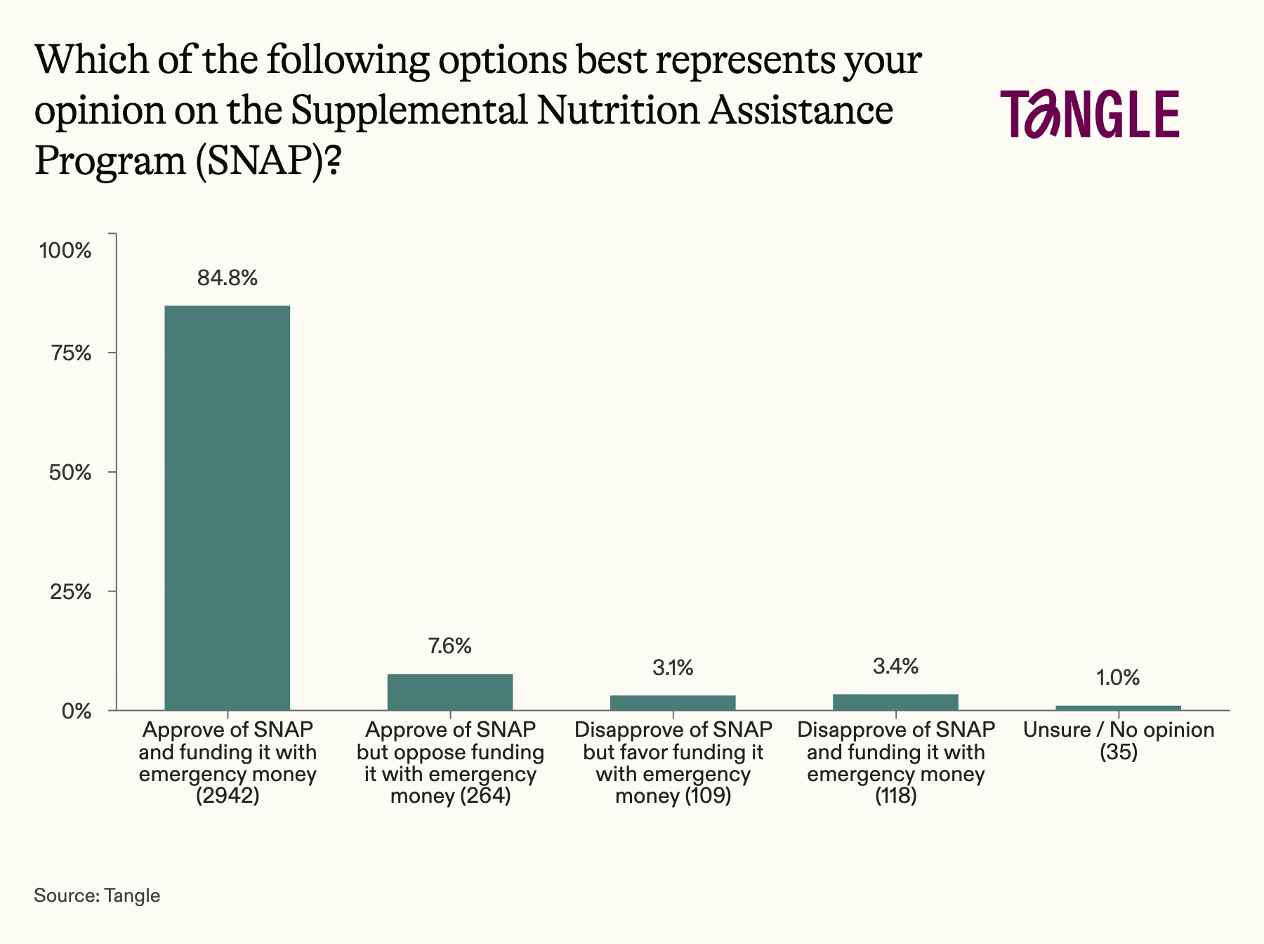 - Yesterday’s survey: 3,468 readers responded to our survey on SNAP funding with 85% approving of the program and funding it with emergency money. “It is immoral to have hungry children in a country as blessed as the USA with resources and global power,” one respondent said. “Midterms are right around the corner. It may be time to hire some folks who are willing to work together to solve some of the issues and challenges our country is currently facing,” said another.