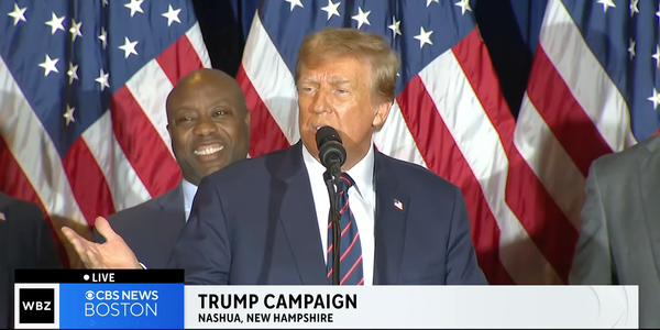 Donald Trump giving his New Hampshire victory speech with Sen. Tim Scott in the background. Screenshot: CBS
