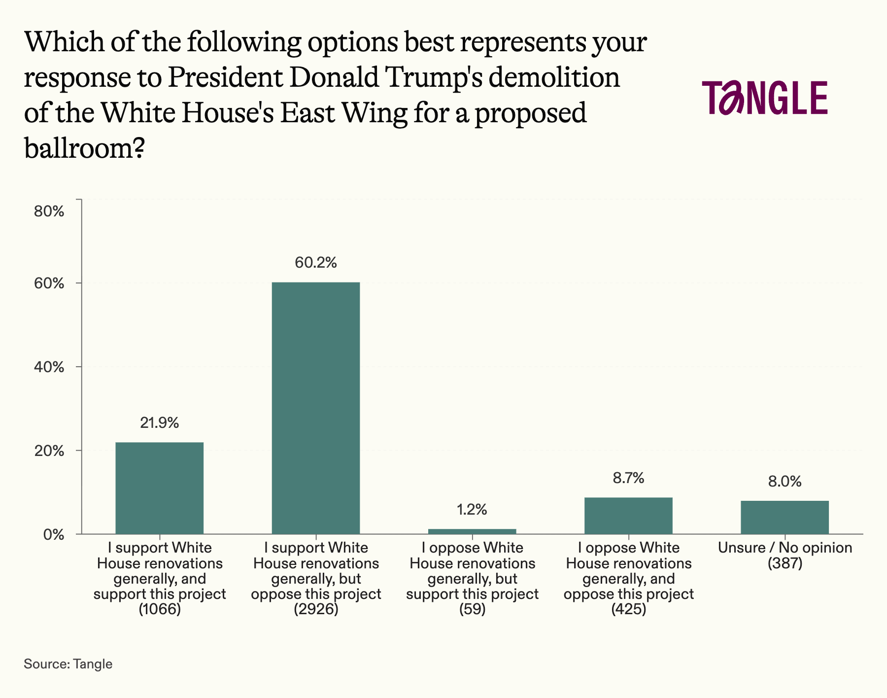 - Yesterday’s survey: 4,863 readers responded to the demolition and planned renovation of the East Wing of the White House with 60% supporting renovations generally but opposing this project. “Can not say it better than Isaac did...I just don’t care,” one respondent said. “The project may be beneficial, but it’s hard to see the people’s house partially demolished,” said another.