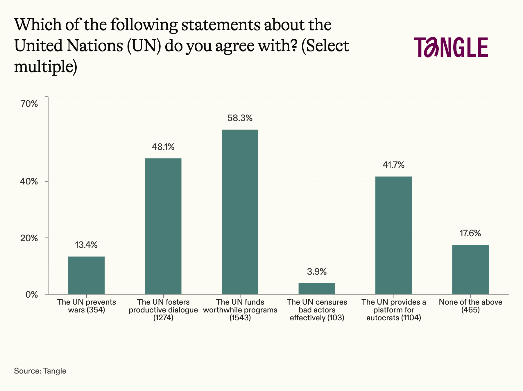 - Thursday’s survey: 2,646 readers responded to our multi-select survey on the United Nations with 58% saying the UN funds worthwhile programs. “Yes the UN does not appear to accomplish much. WHO is an exception,” one respondent said.