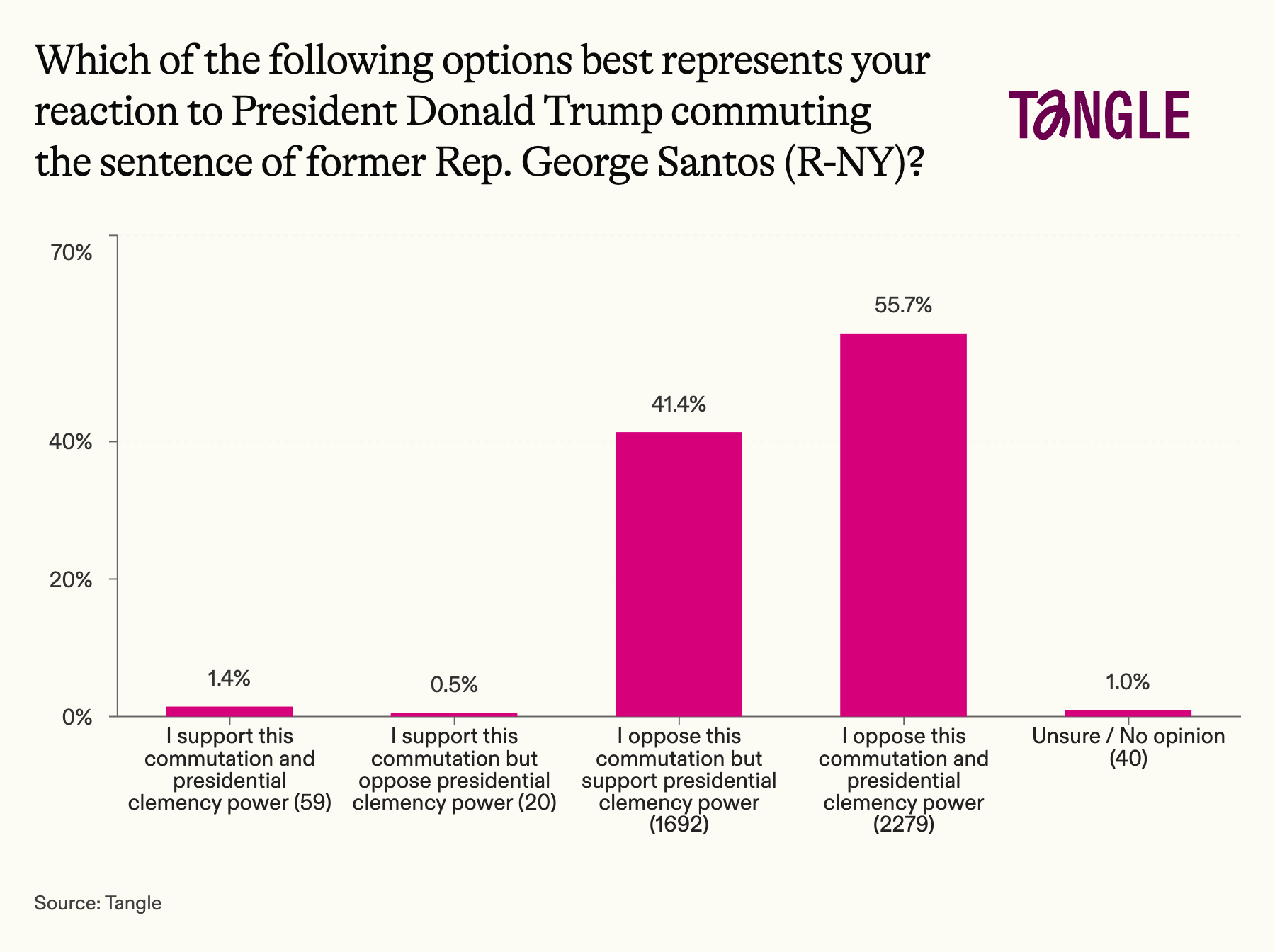 - Yesterday’s survey: 4,090 readers responded to our survey on George Santos’s commutation with 56% opposing the commutation and presidential clemency more broadly. “There needs to be some controls over the pardon power. It has been abused by both sides for decades. That does not make it right,” one respondent said. “At least Trump is transparent about the abuse of clemency power unlike Biden who lied about it, snuck them in at the 11th hour, and delegated the decisions to staffers,” said another.