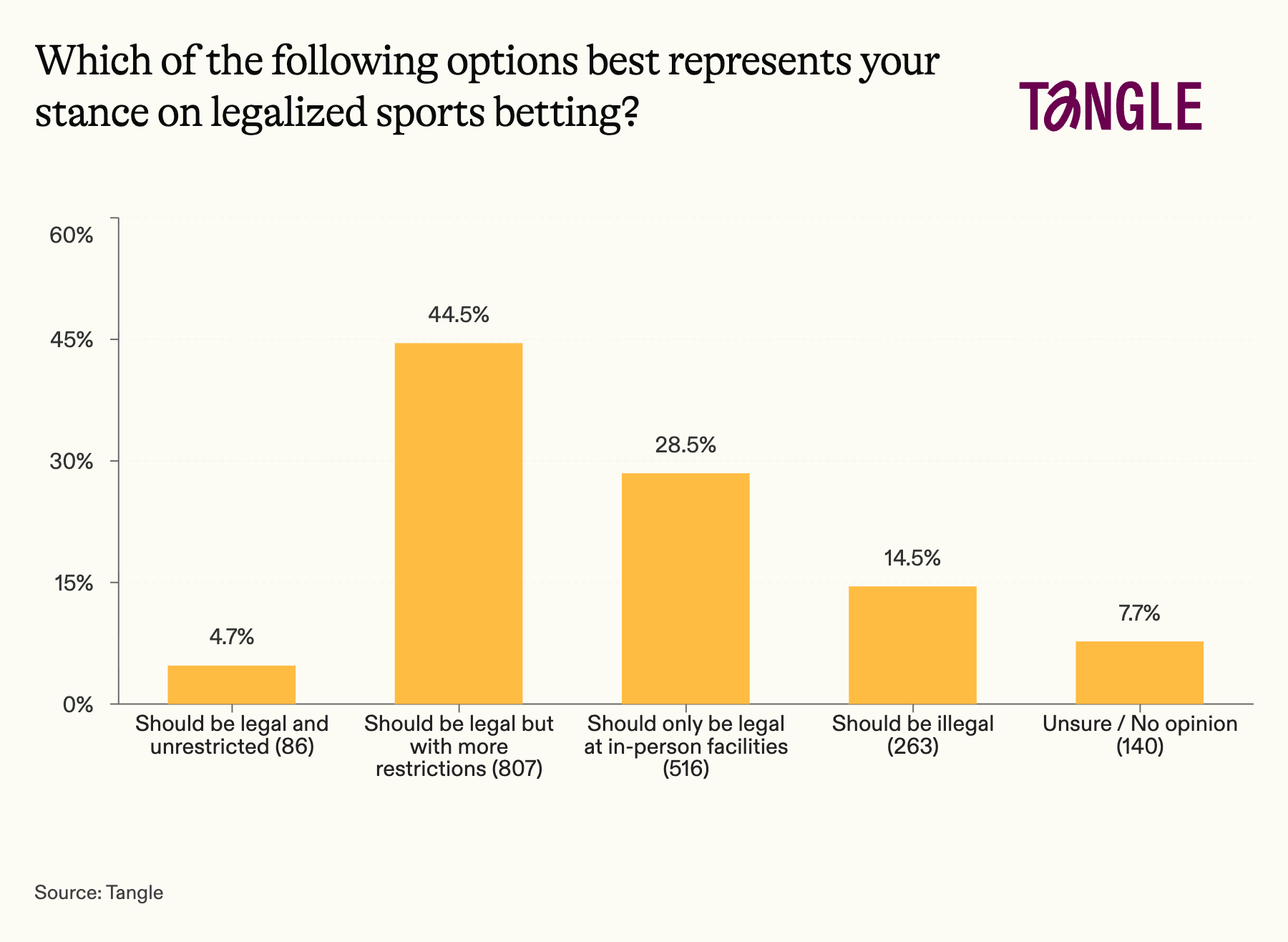 - Yesterday’s survey: 1,812 readers responded to our survey on sports betting with 45% saying it should be legal with restrictions. “This is the land of freedom. If people want to risk funds they could otherwise invest, let them,” one respondent said. “I hardly think this is worthy of coverage considering everything we’re facing as a nation,” said another.