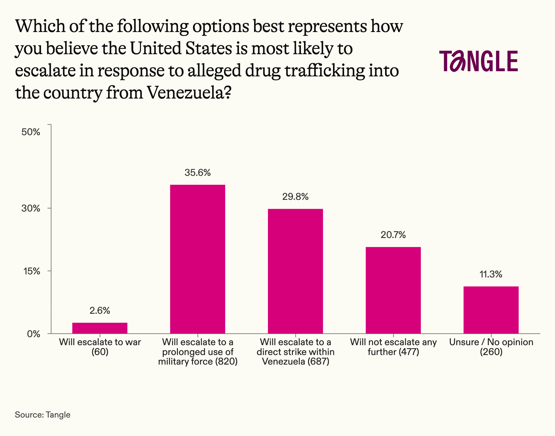 - Yesterday’s survey: 2,304 readers responded to our survey on the U.S.–Venezuela tensions with 36% saying they expect the situation to escalate to a prolonged use of military force. “I have no clue what might happen next, nobody does. That’s a big part of the problem,” one respondent said. “These drug traffickers are murdering US citizens, many of them young people. They have declared war on the US by doing so and should be blown out of the water!” said another.