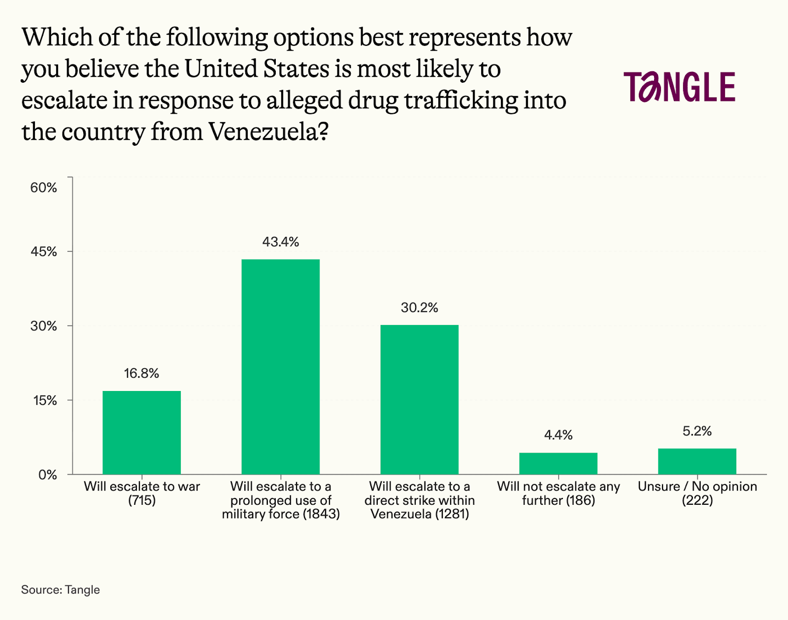 - Yesterday’s survey: 4,247 readers responded to our survey on U.S.–Venezuela relations with 43% saying it will probably escalate to a prolonged use of military force. “Illegal, immoral, uninformed,” one respondent said. “This is needed to make America safe,” said another.