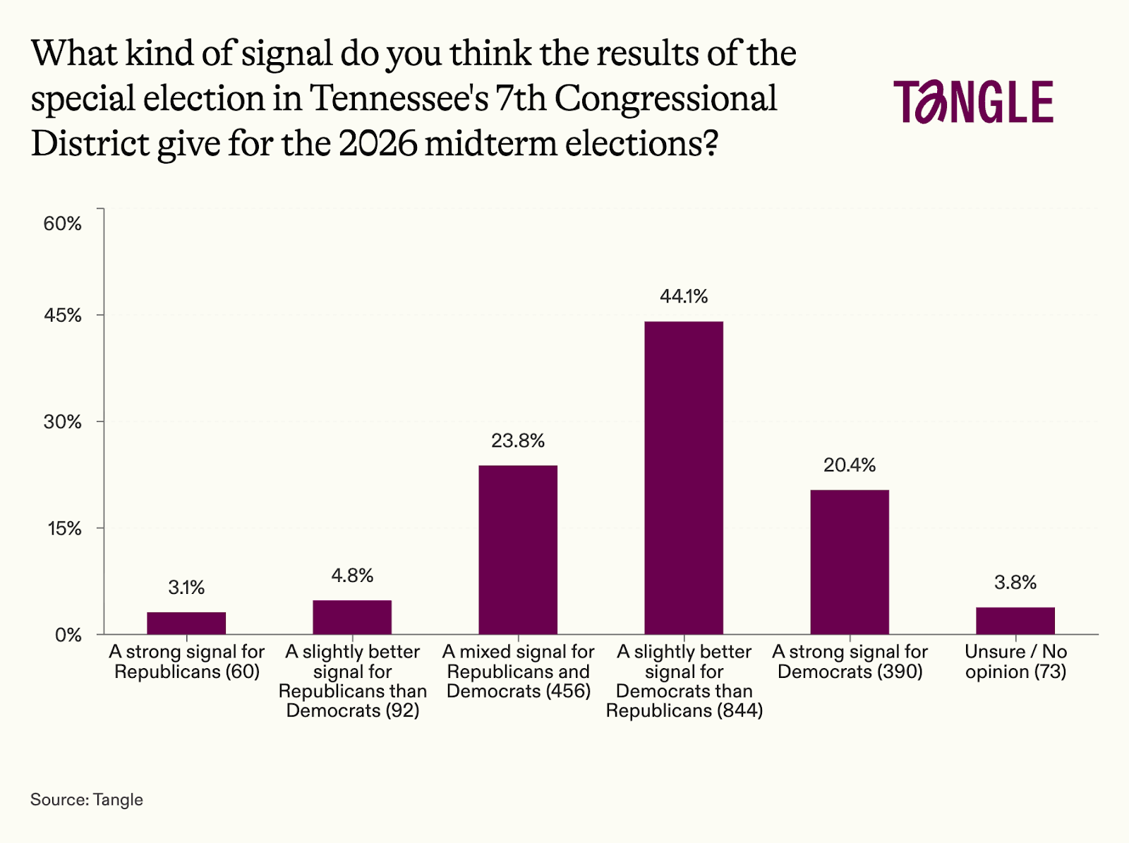 - Thursday’s survey: 1,915 readers responded to our survey on the special election in Tennessee with 44% saying the results provide a slightly better signal for Democrats than Republicans. “If the Democrats can’t pick more palatable candidates, it won’t matter that there's fairly widespread discontent for the current Republicans,” one respondent said. “I don't put too much stock in off-cycle special elections held in the middle of the holiday season,” said another.