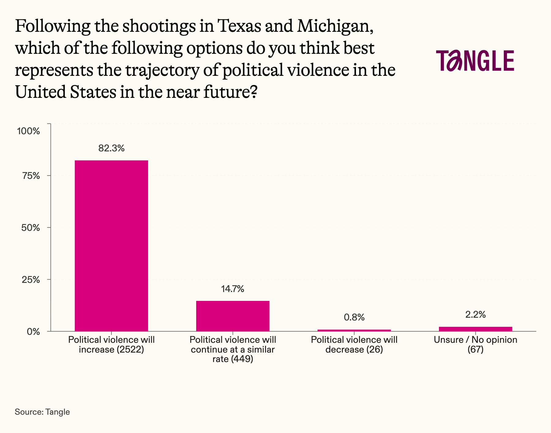 - Yesterday’s survey: 3,064 readers responded to our survey on political violence with 82% saying they expect it to increase. “Political violence will stay the same, but gun violence will increase,” one respondent said. “I would add a great deal, but what is the point? You don't read these,” said another.