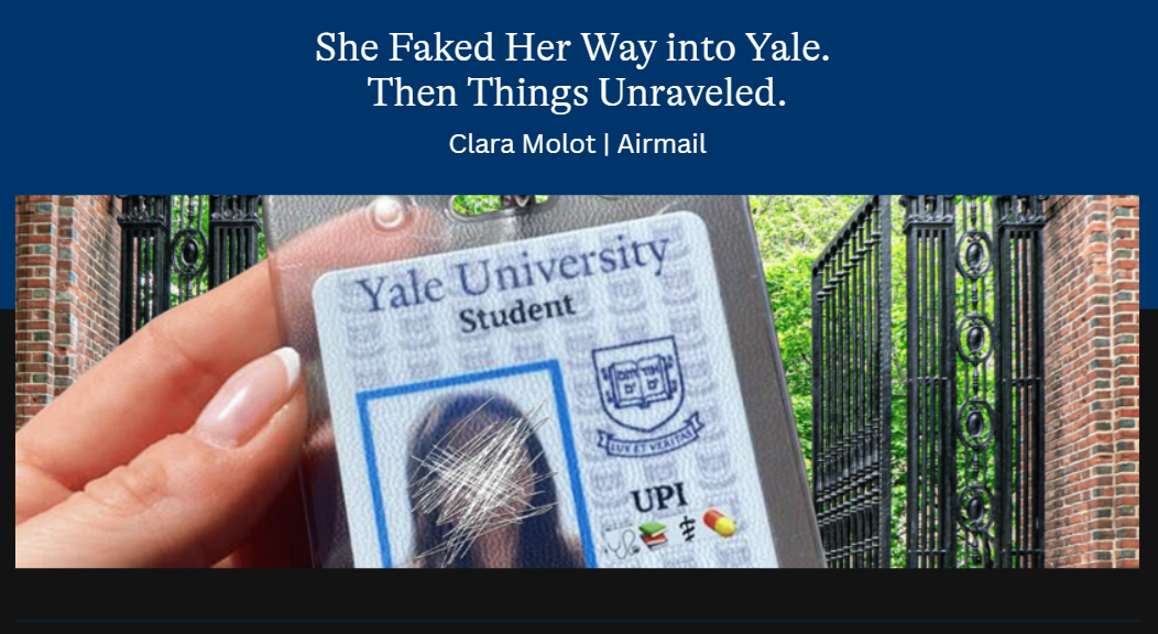 Katherina Lynn arrived for her first semester at Yale after a red-eye flight from her California home. The problem? The nameplate on her door listed her hometown as Tioga, North Dakota — because that was the hometown she’d chosen for the made-up identity she’d used to apply. It didn’t take long for things to unravel from there. Clara Molot tells Lynn’s story here.