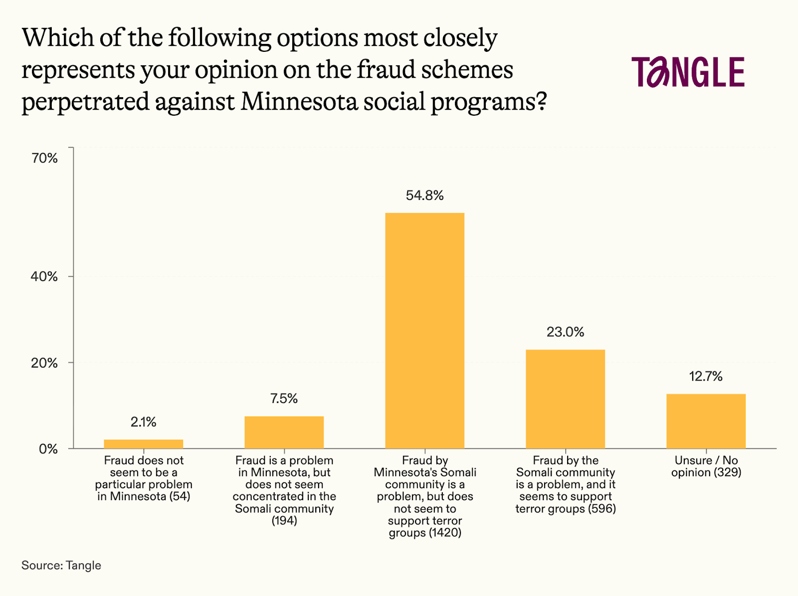 - Yesterday’s survey: 2,593 readers responded to our survey on fraud in Minnesota with 55% saying the fraud is concentrated in the Somali community but doesn’t support terror groups. “Need more details to appropriately form an opinion. There certainly appears to be large-scale fraud and I assume there are a few people benefiting from it, not just the Somali community,” one respondent said. “Where there is smoke there is fire. I will wait for the investigation to uncover the fire, but as I sit today, the Somali culture clash with American Values supports the narrative that some funds were directed to Al Shabaab,” said another.