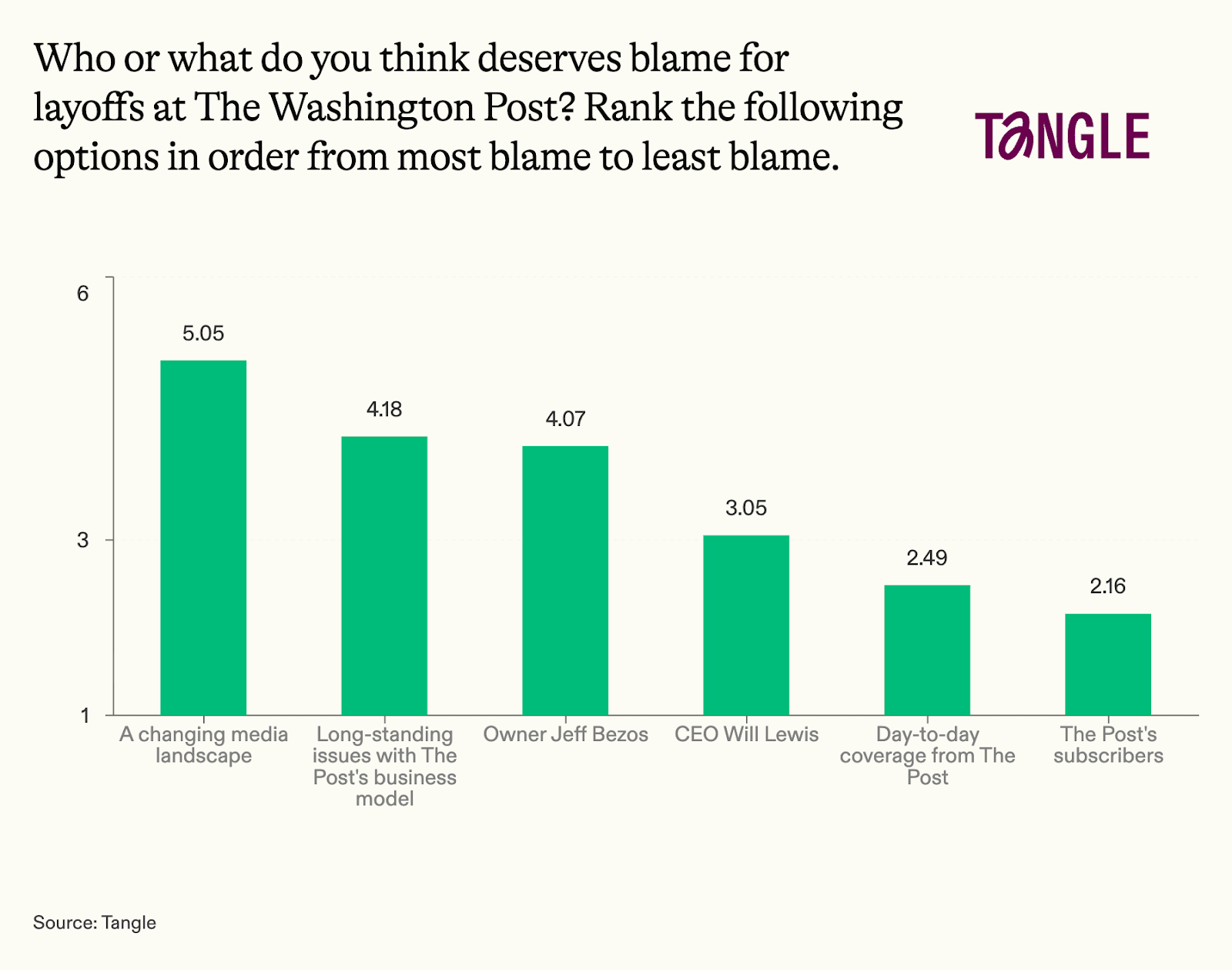 - Yesterday’s survey: 2,105 readers responded to our survey asking them to rank who or what is to blame for layoffs at The Washington Post with most blame placed on a changing media landscape. “I think the post didn’t change with the times both technologically or culturally. Their material was largely left leaning and what business model leaves out 50% of its possible customers?,” one respondent said. “I was one of many, who canceled my subscription, when it was announced that WP would only have conservative viewpoints in their Op-Eds,” said another.