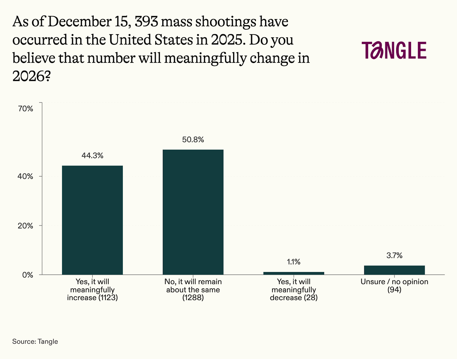 - Yesterday’s survey: 2,533 readers responded to our survey on mass shootings with 51% saying they think the total number will remain about the same in 2026. “Unarmed citizens are sitting ducks for bad actors. See Australia and Brown,” one respondent said. “If evil didn’t have access to guns the numbers would decrease,” said another.