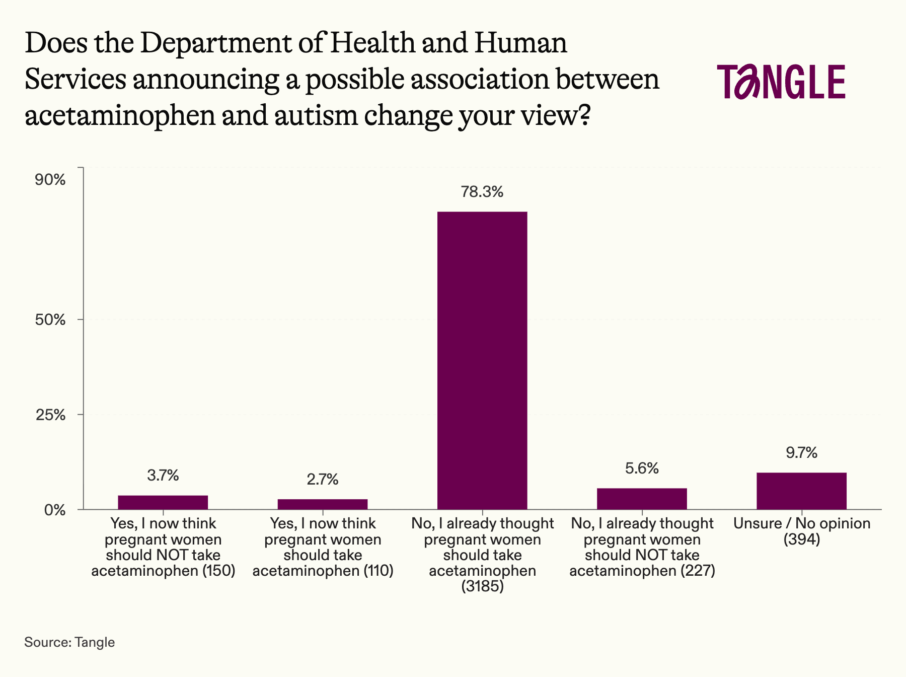 - Yesterday’s survey: 4,066 readers responded to our survey on HHS announcing a possible association between autism and acetaminophen with 78% saying they will continue to see the drug as safe. “The FDA making such a brash, sweeping pronouncement while ignoring contradictory evidence is highly irresponsible and unethical,” one respondent said.