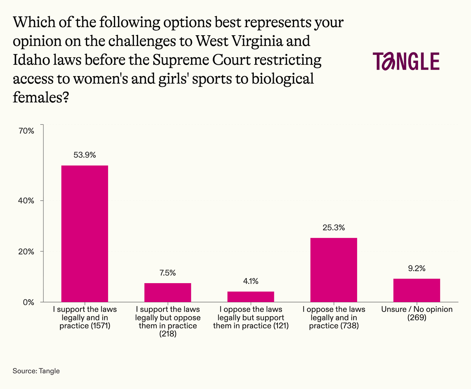 - Yesterday’s survey: 2,917 readers responded to our survey on the state laws restricting transgender women and girls from women’s and girls’ sports before the Supreme Court with 54% supporting the laws in theory and in practice. “You can’t erase biology; a natal male will be inherently stronger than a natal female. This issue, which affects a tiny minority, is taking too much oxygen,” one respondent said. “Allow individual institutions to make laws tailored to their needs. A NCAA ruling that could impact potentially hundreds of thousands of people should be different than a local rec league impacting dozens,” said another.