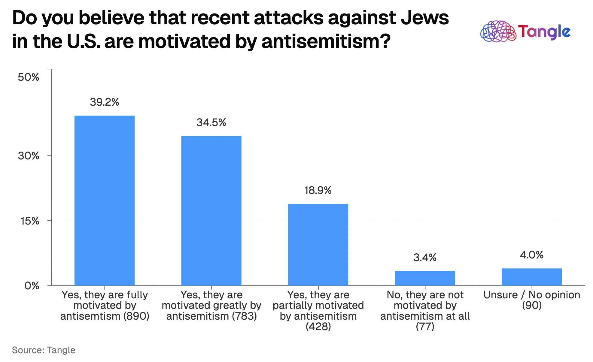 - Yesterday’s survey: 2,268 readers answered our survey on recent attacks against Jews in the U.S. with 39% saying they are fully motivated by antisemitism. “My mind wants to believe that they are attacks against the government policies of the state of Israel. Sadly, my heart is telling my mind that there is a lot of emotional hatred in the world for reasons that have little to do with reality,” one respondent said.